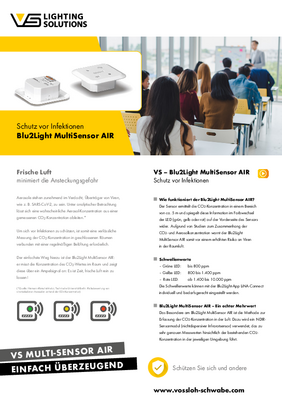 Der Sensor ermittelt die CO2-Konzentration in einem Bereich von ca. 5 m und spiegelt diese Information im Farbwechsel der LED (grün, gelb oder rot) auf der Vorderseite des Sensors wider. Aufgrund von Studien zum Zusammenhang der CO2- und Aerosolkonzentration warnt der Blu2Light MultiSensor AIR somit vor einem erhöhten Risiko an Viren in der Raumluft.